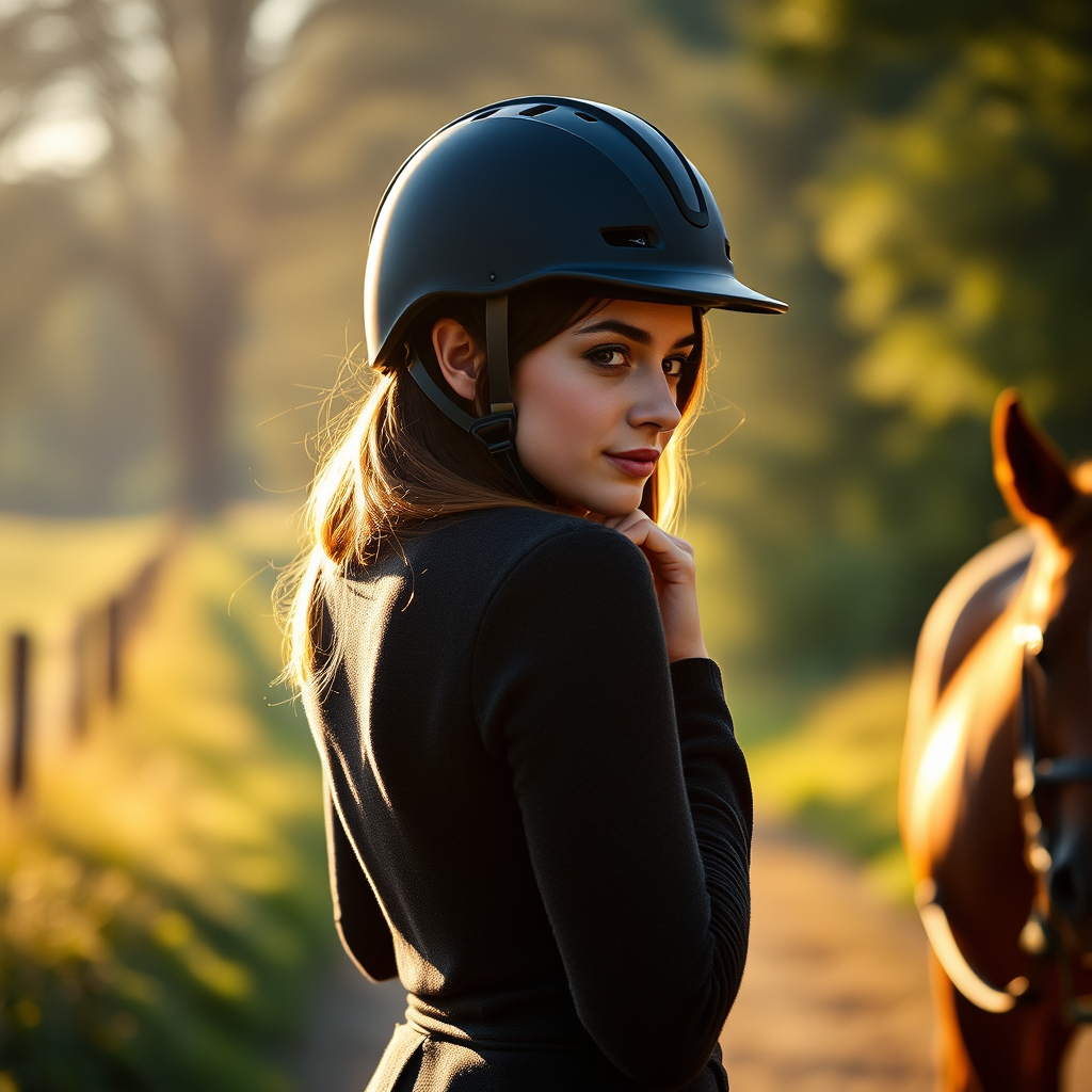 hyper realistic photograph of a modern young brunette female equestrian, looking over her shoulder while fastening her helmet as she prepares to ride a chestnut horse on a serene trail, 8K, side profile, bathed in late afternoon sun, captured in 2023, exquisitely detailed, Leica 50mm lens, Kodak portra 800 film, subtle chiaroscuro play, f1.4 aperture, highlighting the graceful harmony between rider and horse.