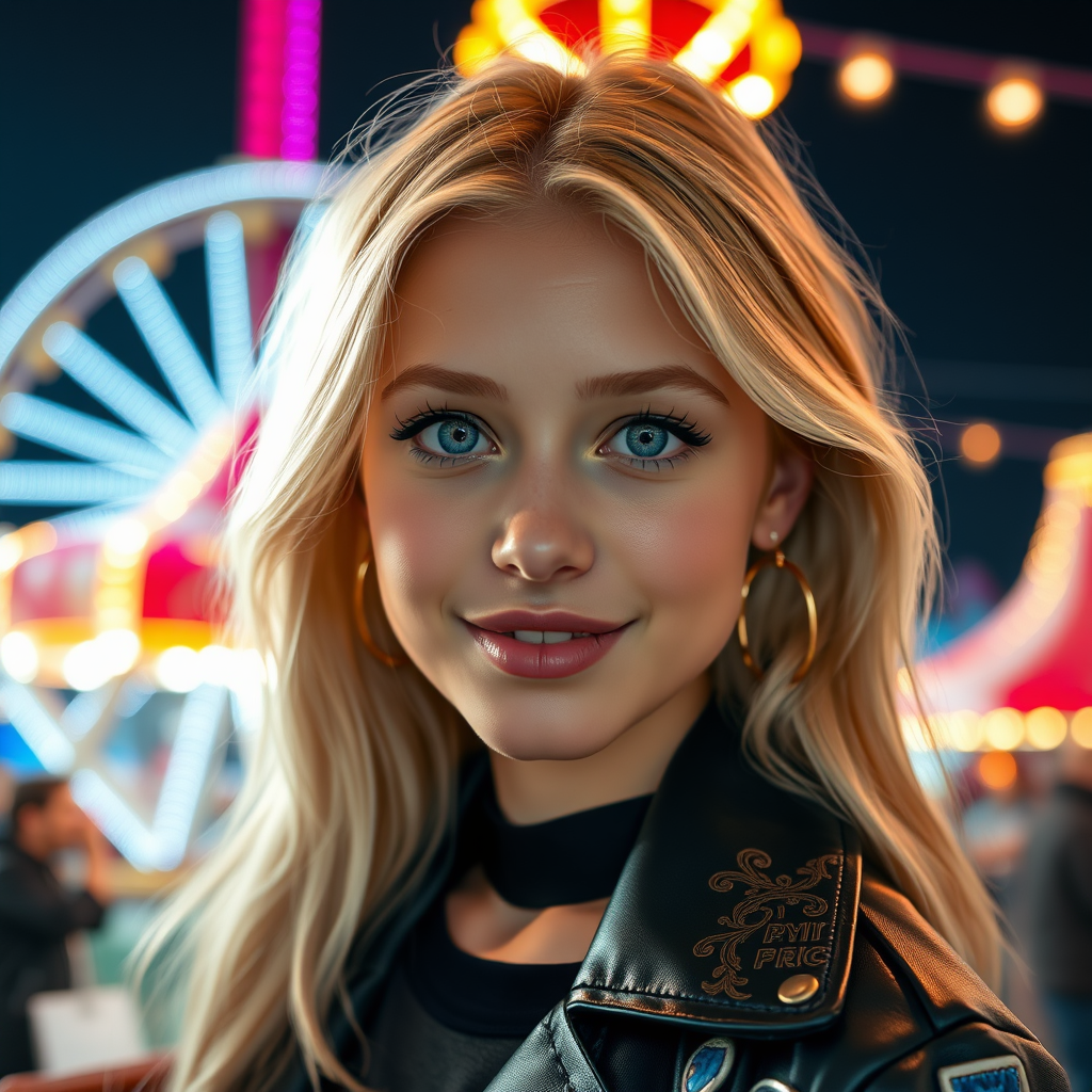Hyper-realistic photograph of a stunning 20-year-old blonde girl at a theme park, showcasing cinematic lighting and exquisite facial features. The atmosphere is vibrant with theme park rides in the background, capturing the excitement of the scene. The girl's expression reflects joy and wonder, perfectly complementing her surroundings. The colors are vivid, enhancing the lively ambiance. Her stylish outfit adds a modern touch, and her eyes sparkle with intrigue, epitomizing the thrill of youth. The composition harmoniously blends realism and emotion, resulting in a captivating masterpiece.
