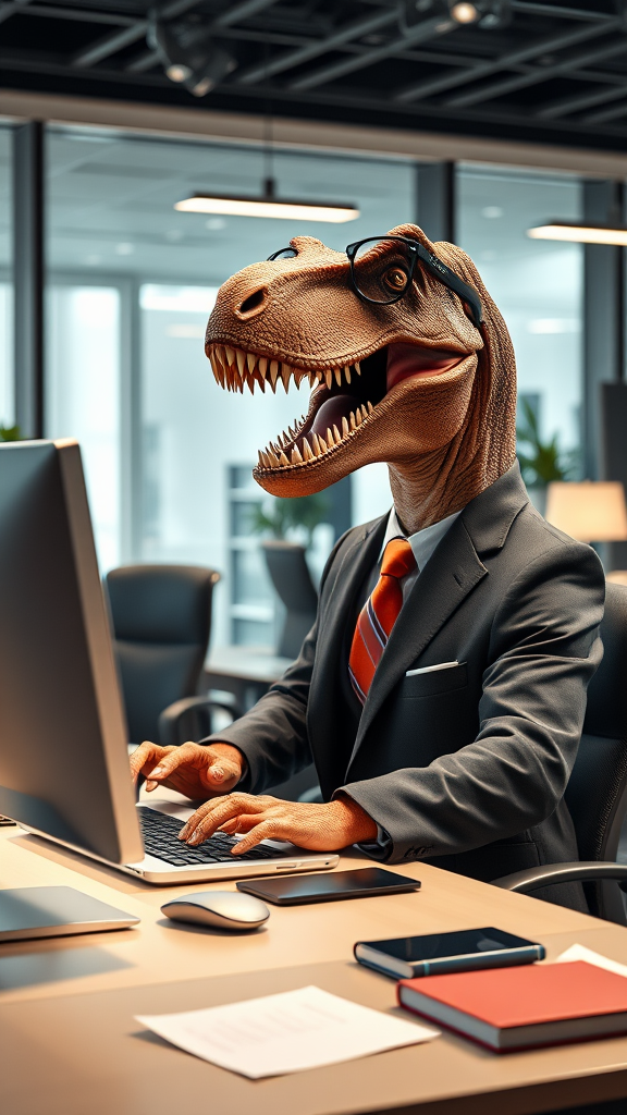 Hyper realistic photograph of a T-Rex in a modern and spacious office, diligently typing on a sleek computer, wearing a finely tailored suit with a vibrant tie, stylish glasses perched on its snout, surrounded by contemporary office decor, wide angle shot capturing its full body, 8k resolution, HD quality, perfect symmetry.