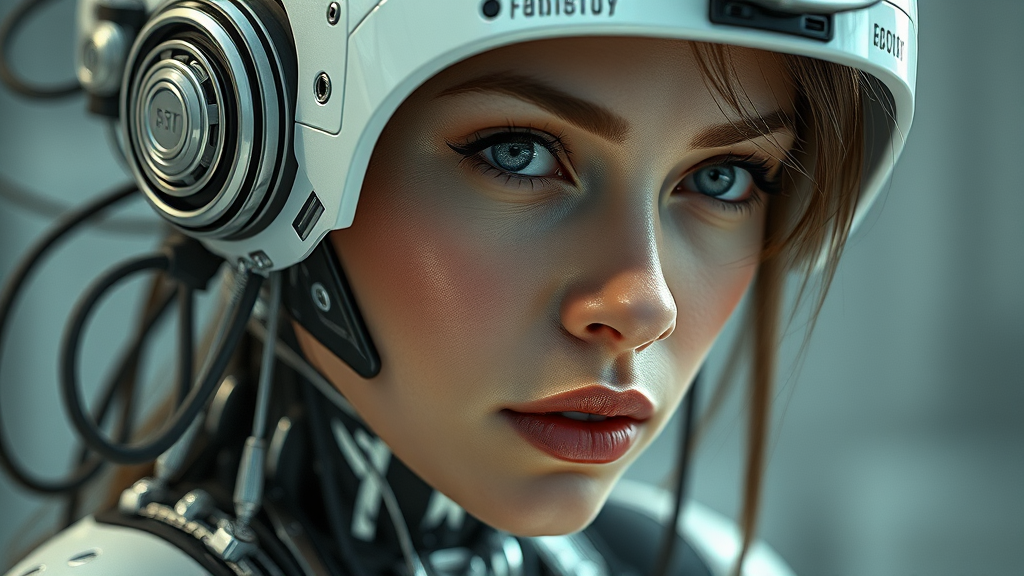 Hyper-realistic photograph of a woman integrated with robotic elements, featuring intricate 3D character design, hard surface modeling, and real-time VFX. The image is trending on ArtStation, showcasing highly detailed and sharp focus, captured in UHD and HDR. The composition is slightly out of frame, with elements of intentional imperfection like blurred sections, unusual proportions, and indistinct markings suggesting signatures or descriptions, subtly mimicking a watermark.