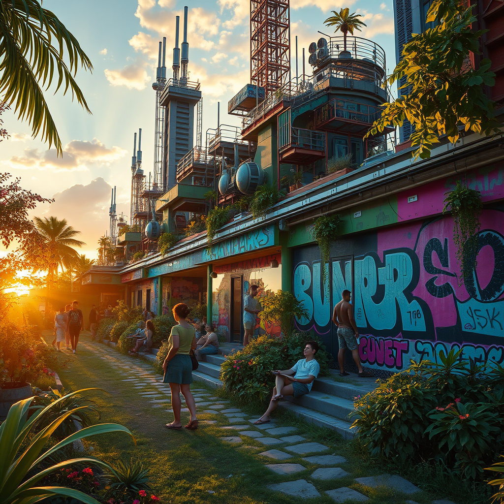 Hyper realistic photography of a solarpunk summer evening relax scene, gaining popularity on artstation, 8k, masterpiece quality, with vibrant graffiti art, exquisite details, bursting with an array of colors, complex and intricate elements, golden ratio composition, serene ambiance, lush greenery intertwined with futuristic architecture, people enjoying leisure amidst eco-friendly innovations, warm golden light casting soothing shadows.