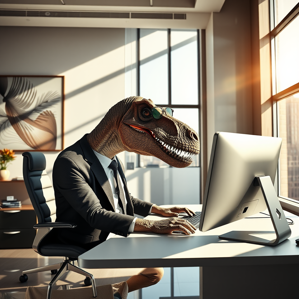 Hyper realistic photography of a T-Rex in a modern, spacious office setting, intensely focused on a computer screen. The dinosaur is dressed in a sharp suit and tie, with stylish glasses perched on its nose. The office is well-lit with large windows and contemporary artwork. The image is a wide-angle, full-body shot, capturing the T-Rex's impressive stature while seated at the sleek office desk. Streaming sunlight casts dynamic shadows on the polished floors. Shot in ultra-high-definition 8k for exceptional detail and clarity.