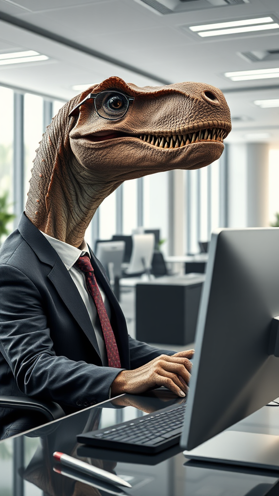 Hyper realistic photography of a T-Rex in a modern, spacious, and bright office environment, intently focused on using a sleek, high-tech computer. The T-Rex is dressed in a sharp suit and stylish tie, with glasses perched on its snout, exuding a sense of professionalism. The scene is captured in a wide angle, showcasing the full body of the dinosaur amidst the contemporary office setting. The image is rendered in 8k resolution, ensuring every detail is vividly clear, capturing the juxtaposition of prehistoric and modern elements.