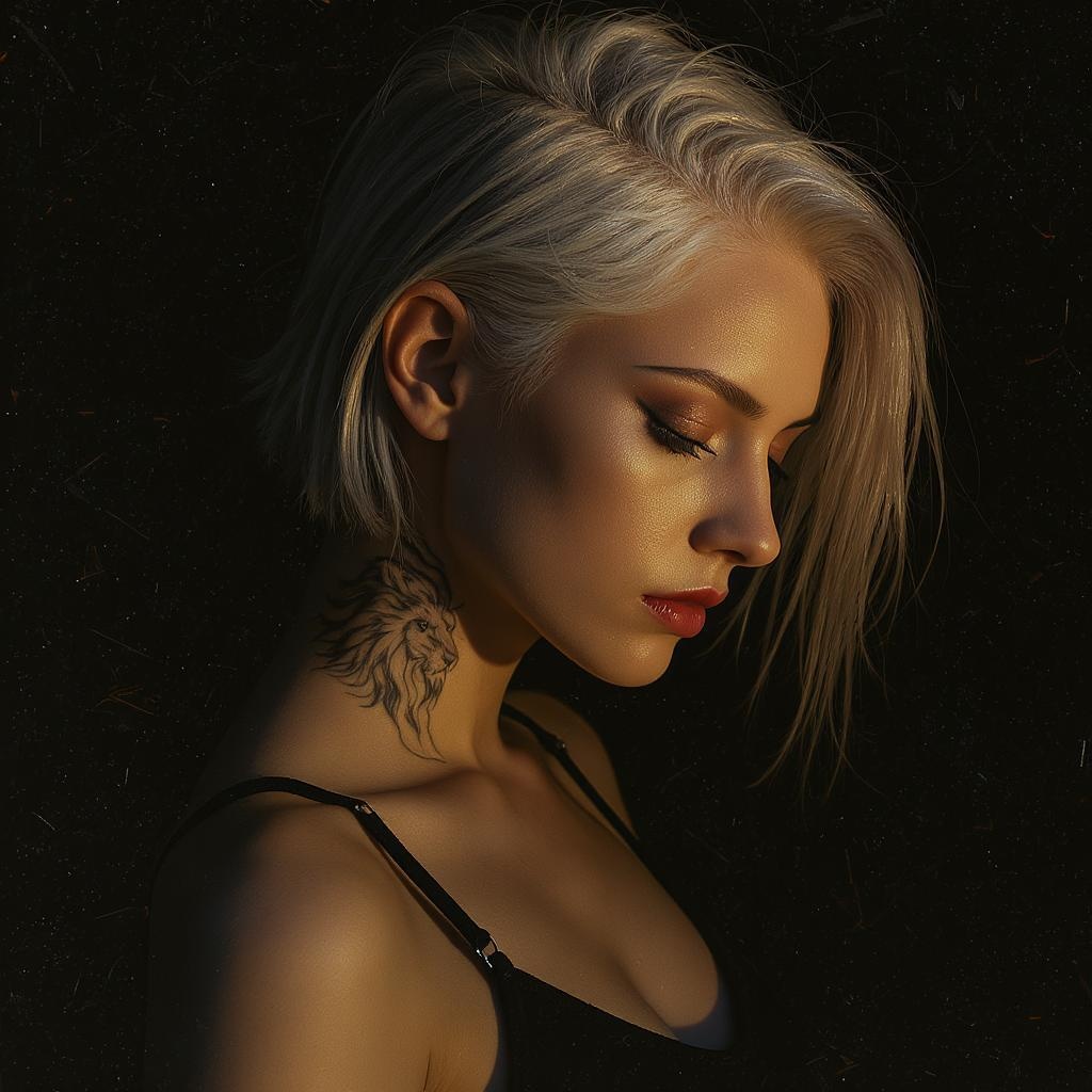 Hyper-realistic photography portrait of an elegant European female model with a striking lion tattoo on her neck, embodying a future punk aesthetic. Her hair is a striking shade of silver-white, perfectly complementing the vibrant ambiance of summer. Captured in dramatic, contrast-rich lighting, she gazes downward, evoking mystery and intensity. The shot features a delicate film grain texture, reminiscent of a Leica 50mm lens paired with Kodak Portra 800 film. A chiaroscuro effect enhances the play of shadows and light, all captured at f1.4 during the mesmerizing glow of golden hour.