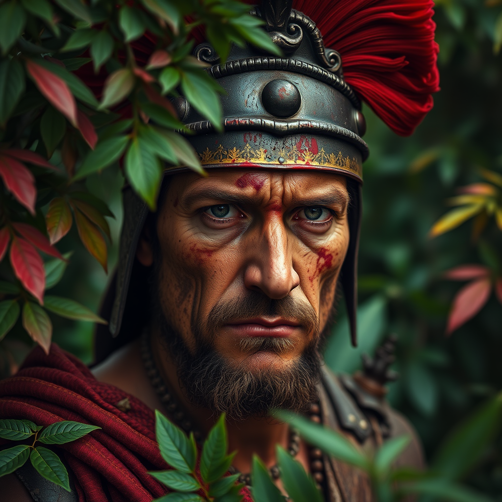 Hyper-realistic portrait of a battle-worn hoplite in a state of emotional turmoil, set against the backdrop of a dense, vibrant rainforest. The image features bold and dynamic colors captured with a Nikon D850 using an 85mm lens at f/1.8, showcasing intense contrast and vivid hues. The shallow depth of field emphasizes the hoplite's expression, while the lush foliage surrounds him in a surreal embrace. The square aspect ratio enhances the composition, and a raw, natural style captures every detail of his weary visage amidst the verdant environment.