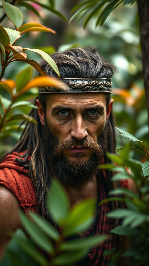 Hyper-realistic portrait of a weary hoplite amidst a vibrant rainforest, showcasing a sense of desolation, captured with a Nikon D850 and 85mm lens at f/1.8. The composition highlights intense contrast and vivid colors with a shallow depth of field, conveying an atmosphere of bold energy while retaining a raw, natural style. The scene embraces the lush surroundings, using a 1:1 aspect ratio to focus on the hoplite's intricate details and emotional depth.