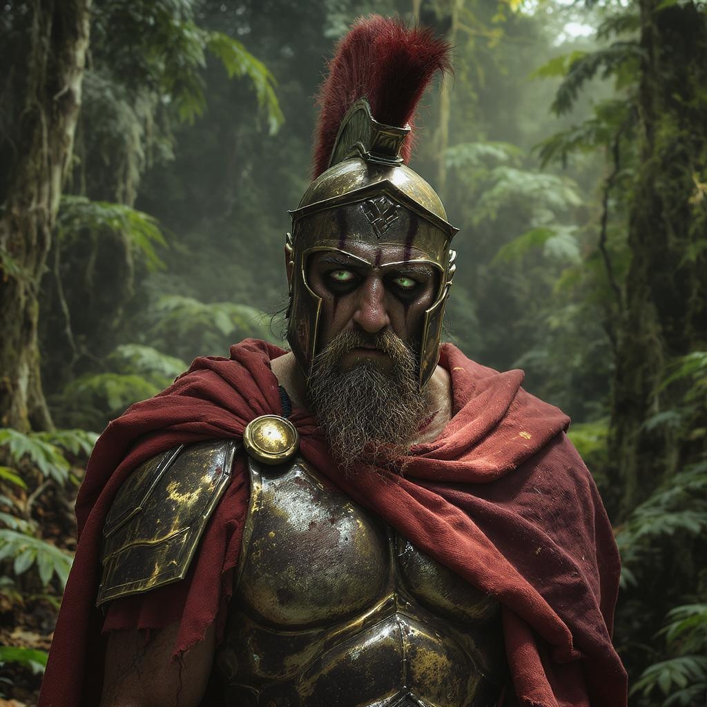 Hyper-realistic portrait of a weary hoplite, melancholic expression, set against a dense rainforest backdrop, featuring vibrant and dynamic colors, captured with a Nikon D850, 85mm lens at f/1.8, showcasing intense contrast and vivid hues, with a shallow depth of field, maintaining a 1:1 aspect ratio, enhanced with a raw and natural style.