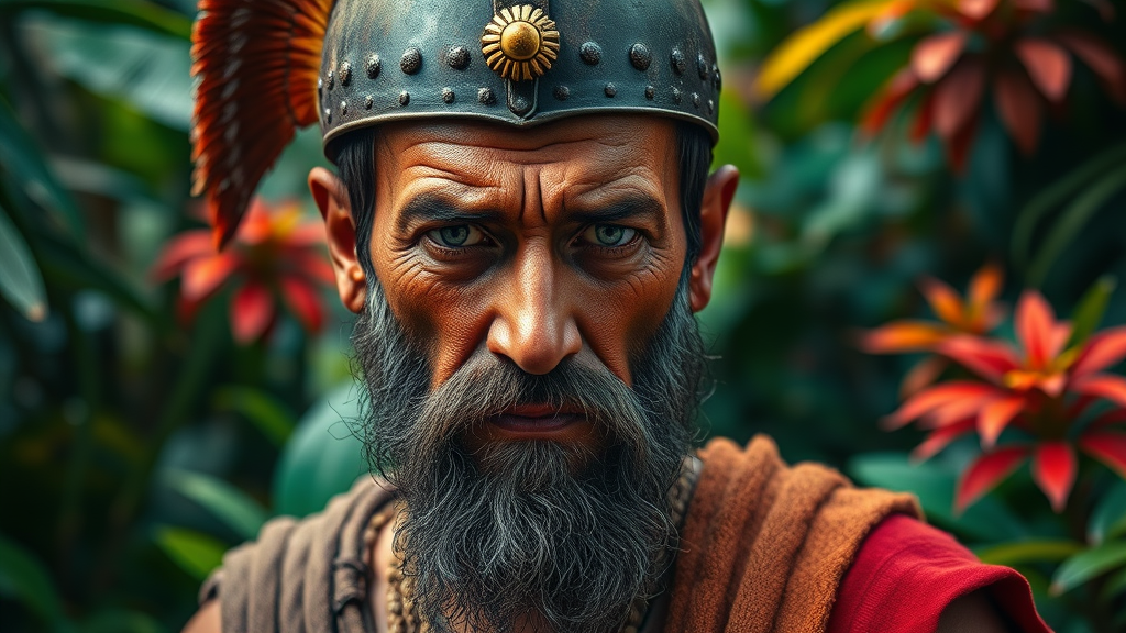 Hyper-realistic portrait of a weathered hoplite with a look of sorrow, set against a vibrant rainforest backdrop, the scene alive with rich, energetic colors. Shot with a Nikon D850 using an 85mm lens at f/1.8, showcasing intense contrast and vivid hues. The shallow depth of field blurs the lush foliage, drawing focus to the distressed expression. Maintain a raw, unfiltered style while emphasizing the interplay of light and shadow for dramatic effect.