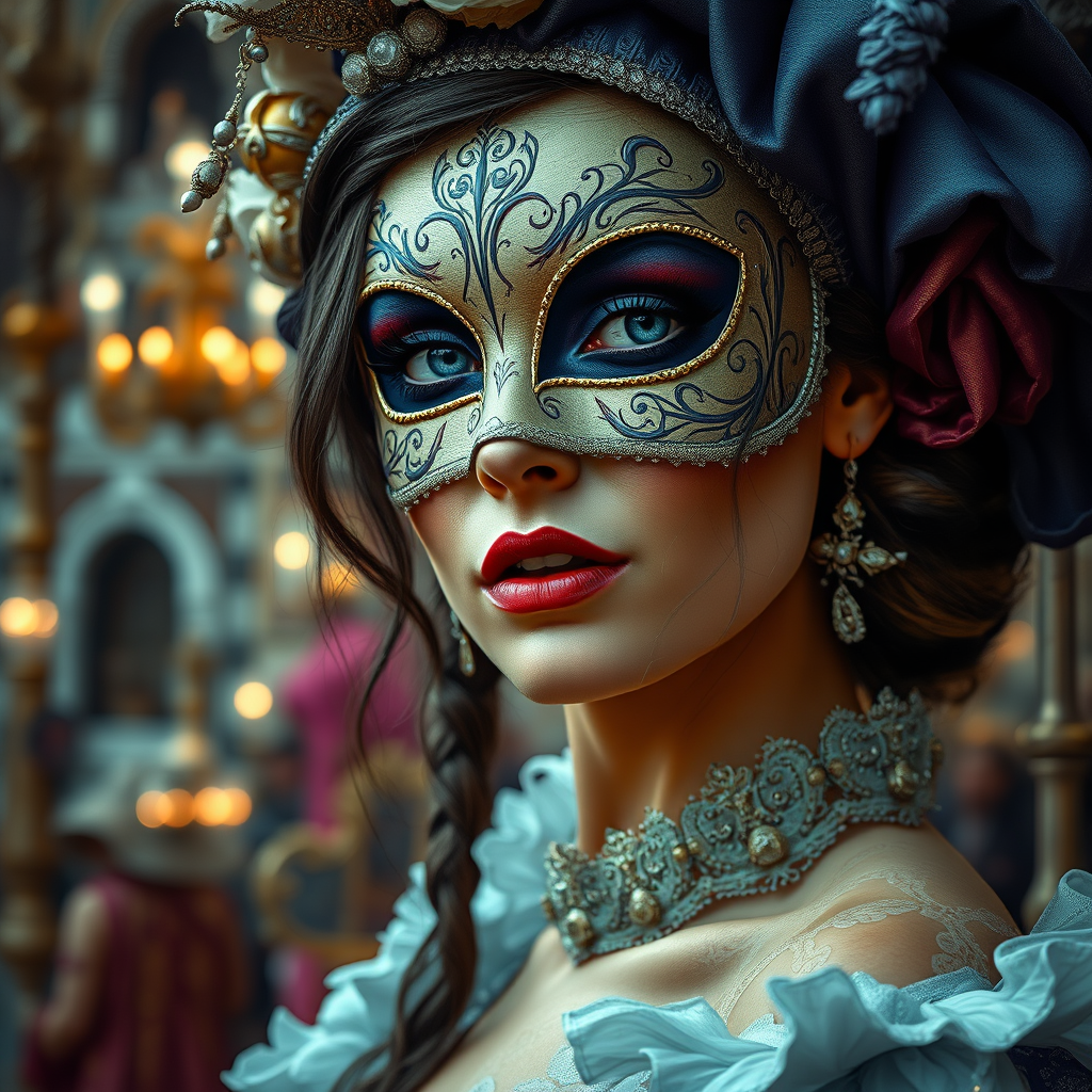 Hyper-realistic portrait of a woman at the Venetian carnival, exquisitely detailed and rendered in the style of an oil painting by Gerald Brom, capturing a surreal yet lifelike blend of textures and colors; her features are sharp and expressive, embodying a captivating allure without a mask, amidst an opulent carnival backdrop, evoking the grandeur and mystique of the event with minute attention to nuances and lighting, reminiscent of the Unreal Engine’s stunning visual depth and hyper detail.