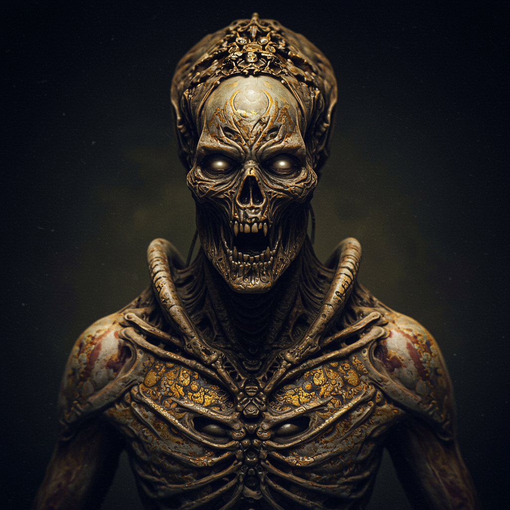 Hyper-realistic portrait of a zombie xenomorph warrior, infused with the intense detail and sharpness of wet plate collodion photography, reminiscent of Mathew Brady's historical precision. The character stands as a synthesis of Stefan Gesell's modern surrealism, Emil Melmoth's gothic darkness, and the biomechanical intricacy of H.R. Giger, all interwoven with Gustav Klimt's opulent patterns. Its eyes glow faintly amid a texture of decayed flesh fused with alien exoskeleton, adorned with ornate, abstract designs that shimmer eerily, capturing a haunting yet captivating presence.