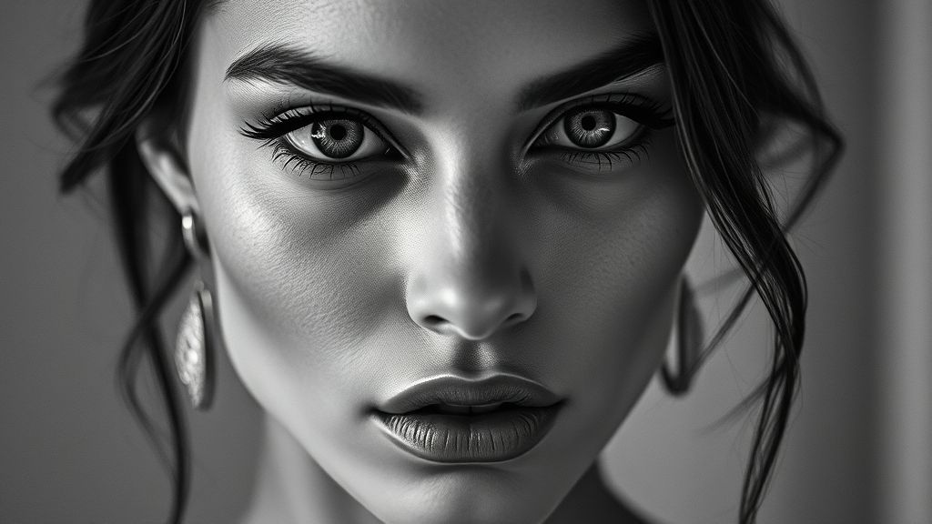 Hyper-realistic portrait of an elegant woman, striking in her beauty, captured in timeless black and white. Taken with a Sony A7III, the image exudes a sense of drama and intensity, her gaze penetrating the lens. The shot incorporates an element of controlled chaos, with a distinct vertical composition. Personal touches are subtly woven in, resulting in an image that's uniquely captivating and stylish, reflecting a modern yet classic aesthetic.