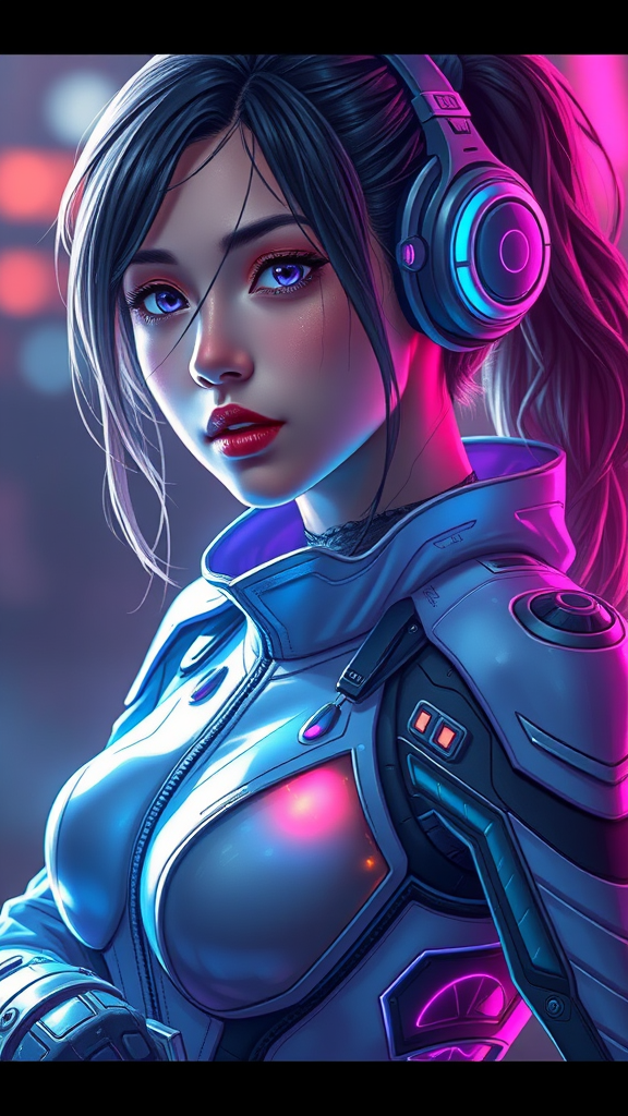 Hyper realistic portrait of an enchanting young woman in a customized futuristic plugsuit, intricately detailed, exuding elements of anime, reminiscent of the style of Greg Rutkowski, vibrant color palette, dynamic pose, ethereal lighting, capturing a sense of adventure and mystery, trending on art platforms.