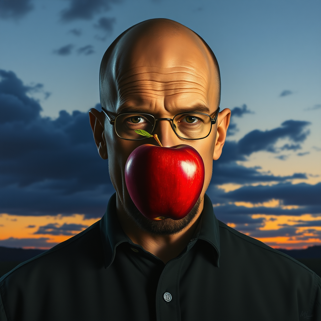 Hyper realistic portrait of Bryan Cranston as Heisenberg from Breaking Bad, standing front and center, a vibrant red apple floating just in front of his face, set against a backdrop of a twilight sky with darkening clouds, oil on canvas in the style of René Magritte's surrealism, reminiscent of The Son of Man.