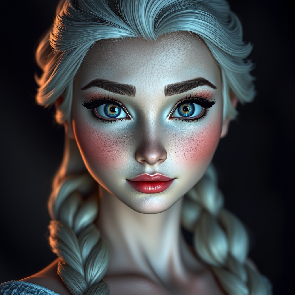 Hyper-realistic portrait of Elsa from Frozen, capturing her in stunning detail with intricately crafted features and sharp focus. The lighting is a mix of hard and foreboding, casting dynamic shadows and enhancing the mood. She is depicted in a perfect full-body pose, showcasing highly detailed skin texture and strikingly beautiful face and eyes. The composition utilizes muted tones for a sophisticated look, resembling a professional HDR photograph, with UHD 16k quality that emphasizes every nuance in hyperrealistic style.