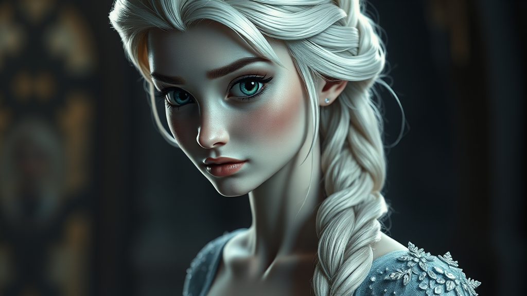 Hyper realistic portrayal of Elsa from Frozen, showcasing intricately detailed features, captured in sharp focus. The composition highlights her perfect, full-body form in a dynamic angle, with highly detailed skin texture and beautifully defined face and eyes. The scene is illuminated with a blend of hard, foreboding light, creating a sense of depth and moodiness. Muted tones enhance the realism, presented in the highest quality professional photography style, offering a realistic, hyperrealistic effect in 16k UHD and HDR.