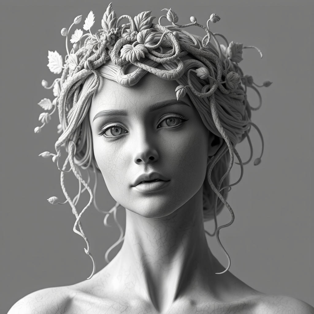 hyper-realistic sci-fi black and white sculpture of a woman adorned with an intricately detailed crown, incorporating elements of zbrush artistry; the crown intertwines with themes of nature, featuring delicate vines and leaves that merge seamlessly with futuristic geometric patterns, the woman's expression serene yet powerful, skin texture so finely detailed it blurs the line between sculpture and reality, invoking a sense of ethereal elegance and otherworldly presence