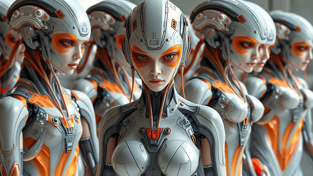 Hyper-realistic sci-fi character designs featuring various forms with a focus on a feminine body, showcasing technological details in light gray and orange tones. These life-size figures are adorned with precise, intricate details and a blend of silver and red accents. The designs highlight advanced technological enhancements and cybernetic elements, creating a seamless integration of organic and mechanical aesthetics. The characters exude a sleek, futuristic elegance in a visionary world.