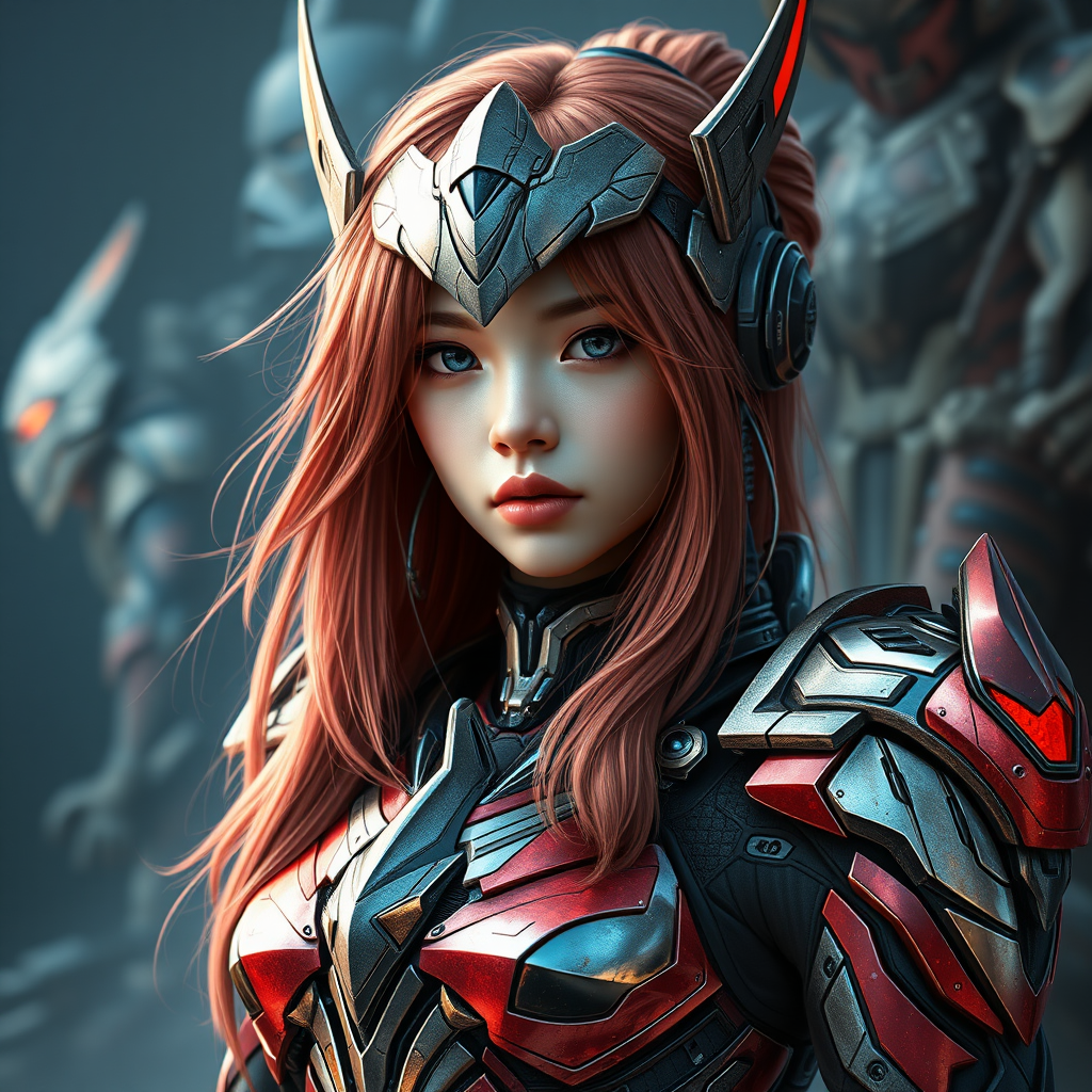 Hyper-realistic striking portrait of Asuka Langley adorned in intricate sci-fi armor, showcasing exquisite details and vibrant colors; the armor blends futuristic technology with elegant design; Asuka's determined expression exudes both elegance and strength; the composition captures the essence of a dynamic and powerful heroine with an otherworldly backdrop that enhances the overall visual impact.