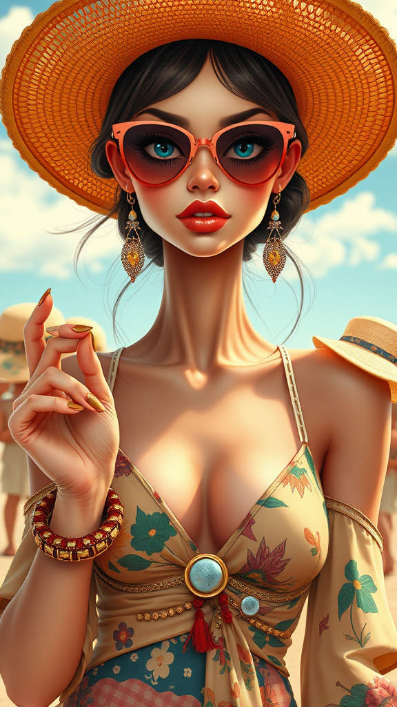 Hyper realistic, stunningly amusing anime, high fashion model with an elegant array of high heels and chic sandals, accessorized with stylish hats and sleek sunglasses. Featuring breezy sun dresses with a 1960s retro futuristic twist, combined with a boho whimsical hippie vibe reminiscent of an American Gothic portrait style. The imagery captures a supermodel with a beautifully detailed face, inspired by the artistic styles of Charlie Bowater, Gil Elvgren, and Jack Hughes. Rendered in 8k, UHD, HDR for sharp detail and rich colors. Unique elements include a cross-eyed gaze, elongated neck, and quirky hand features, adding a playful twist. The composition avoids issues like low resolution, out-of-frame elements, blurriness, or unwanted visual artifacts such as watermarks, logos, or text, ensuring a polished and cohesive aesthetic without any cartoonish, split, or cropped images.