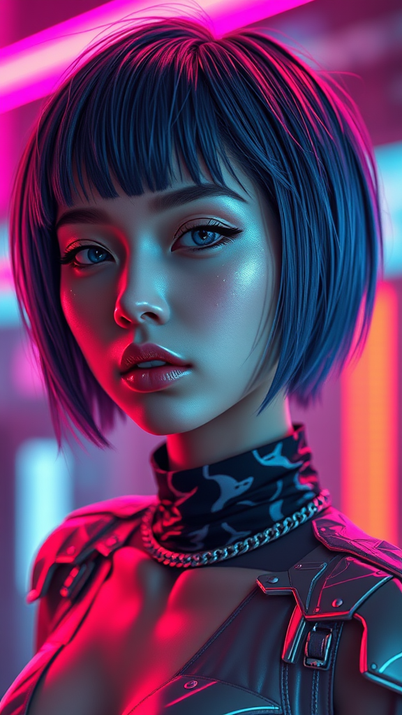 Hyper-realistic, ultimate masterpiece, unparalleled art, ultra-high-definition, featuring medium and short hair with a pearl illusion effect, set in a cutting-edge cyberpunk environment; highlighting contemporary fashion trends with 3s material composition in HD detail. Captures exquisite complex details using c4d and 3D modeling with octane rendering and ray tracing. Animated lighting enriches the scene, utilizing advanced OCrenderer technology to achieve a stunning 8K output.