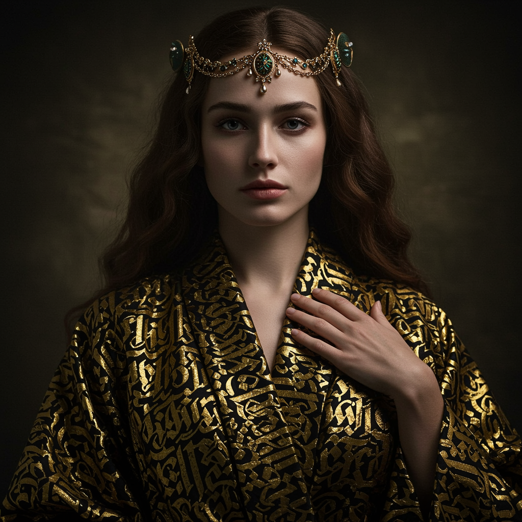 Hyper-realistic ultra detailed portrait of a stunning girl reminiscent of Alex Garland's style, adorned in an exquisite golden and black robe intricately embellished with artistic calligraphy. The artwork embodies the essence of Art Nouveau, capturing her ethereal beauty with a cinematic quality. Her expression is both captivating and enigmatic, enhanced by the robe's shimmering textures. Shot in 8k resolution, the image boasts unparalleled detail, immersing the viewer in its vivid realism within an elongated aspect ratio of 9:16.