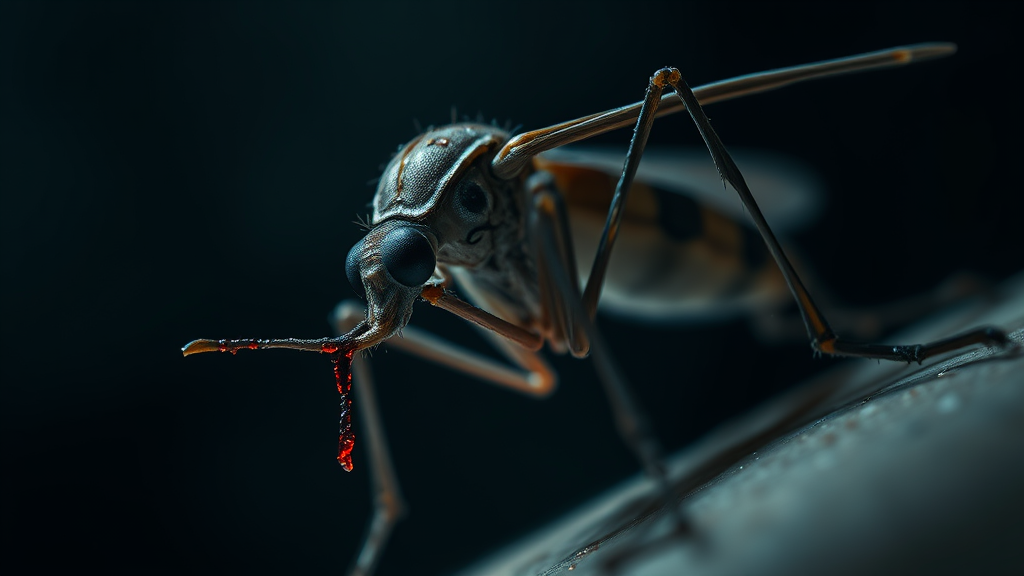 Hyper-realistic unnerving mosquito with intricately detailed skin under dim natural light, its unsettling presence enhanced by a chilling setting. The mosquito is eerily alive, yet its eyes are pitch-black and lifeless, exuding an air of malevolence. Blood drips ominously from its elongated form, while sinister scars mar its fragile body. The atmosphere is filled with dread as the background deepens in shadow, barely distinguishing the sharp, exaggerated fangs that protrude menacingly. This is a close-up glimpse into a world where horror and reality intertwine, leaving an indelible mark on the viewer's psyche.