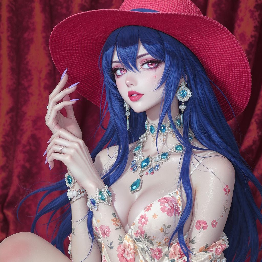 Hyper realistic vibrant anime-inspired artwork featuring a stunning fashion model, seamlessly blending high fashion elements with playful humor. The model dons an ensemble of high heels, chic sandals, wide-brimmed hats, and stylish sunglasses, complemented by cool sun dresses. Infused with a nod to 1960s retro futuristic style, and the whimsical essence of boho hippie fashion, the setting echoes the iconic composure of an American Gothic portrait. The model’s exceptionally detailed, striking face exudes the creative signatures of artists like Charlie Bowater, Gil Elvgren, and Jack Hughes, rendered in breathtaking 8k, UHD, and HDR quality. Unique creative twists include mirrored facial features, slight facial duplications hinting at duality, an intriguing cross-eye element, an elongated elegant neck, and artistically exaggerated hands. The art captures a mesmerizing blend of human beauty with a touch of surrealism against a clean backdrop, with no low-resolution or distracting elements. The piece invites exploration through its intricately detailed, cohesive presentation with a focus on vibrant artistry.