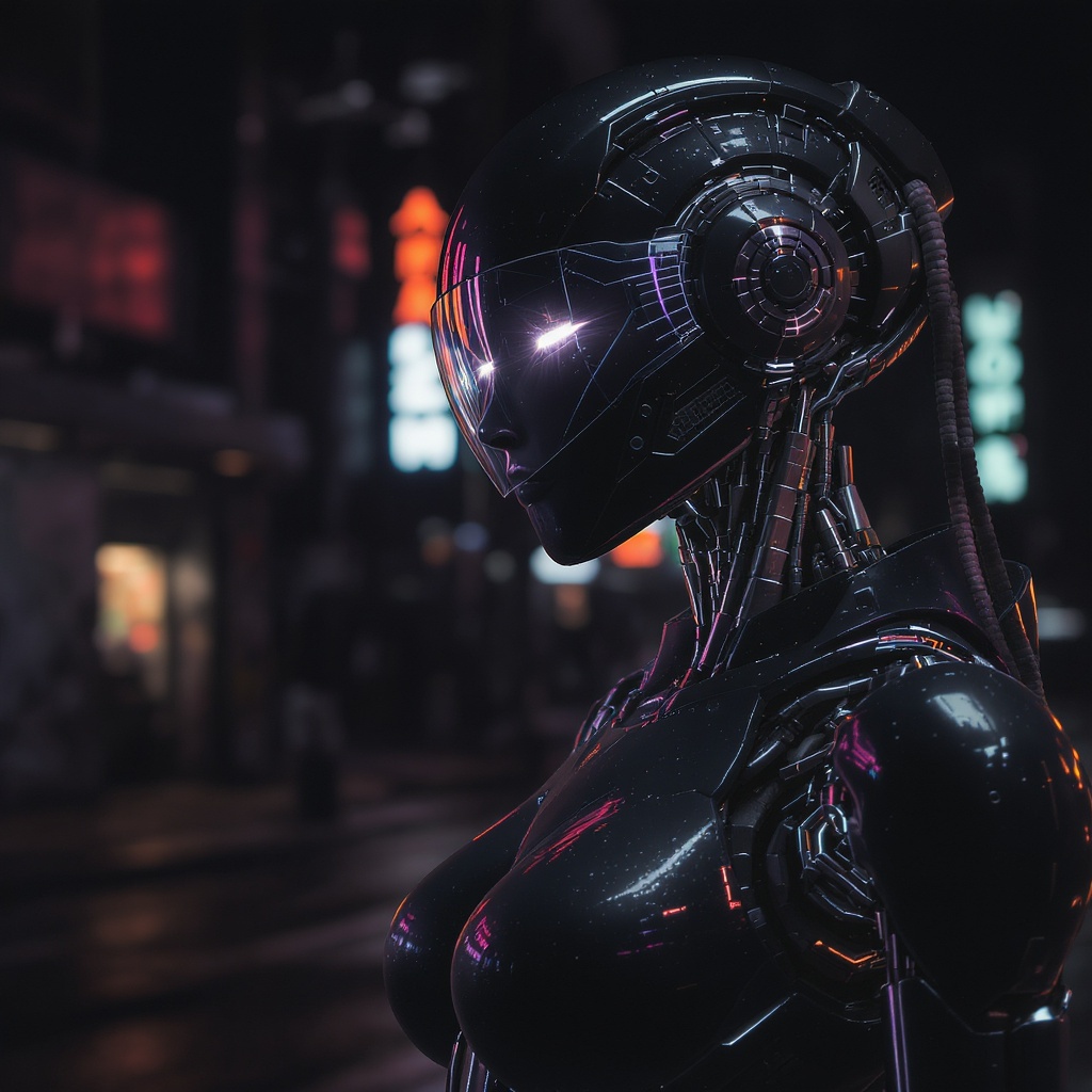 View this AI-generated image featuring hyperdetailed photo mid shot photo futuristic security robot inspired by martha wells female form sleek armor transparent visor cyberpunk aesthetic captured with fujifilm x t4 sony fe 85mm f 1 4 lens gritty urban backdrop low light with neon glows mechanical el