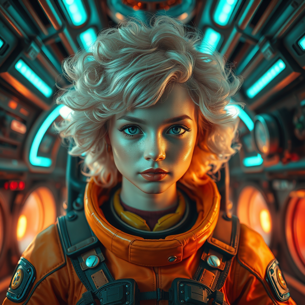 Hyperdetailed steampunk spaceship interior capturing a cinematic shot with a focus on the upper body, beautifully centered using a 100mm lens at the perfect angle, evoking an award-winning feel. An intricately hyperdetailed whimsical girl with blonde fluffy hair is adorned in an elaborate orange and green steampunk-inspired space suit. Her exquisitely detailed face features glossy lips, enhanced by cinematic, volumetric, and studio lighting that casts a web of soft shadows and neon reflections. The scene bursts with vivid colors and contrast, brought to life by global illumination and the subtle interplay of neon lights, reflecting the charm of a steampunk fantasy realm.