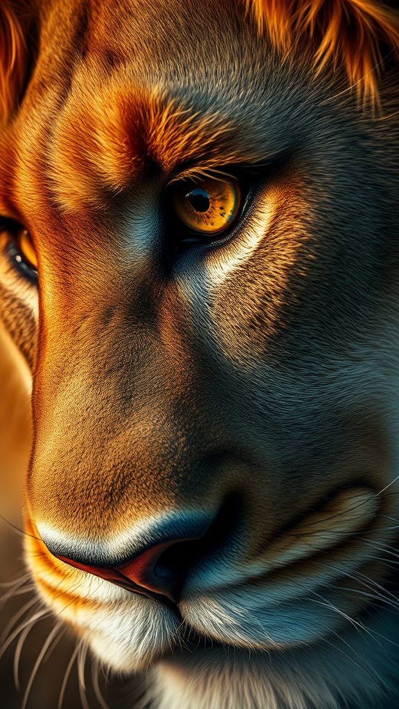 Hypermacro photograph capturing the intense gaze of a lion's eye, brimming with fierce determination, raw ferocity, and fiery emotion. The ultra-close-up reveals an expressive and realistic portrayal, showcasing hyperrealism with cinematic lighting. The image is ultra-detailed, with the highest quality and ultra-realistic features, evoking a sense of 4D dimension through intricate textures and shadows.