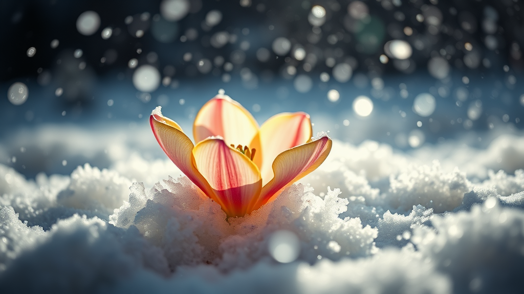 Hypermacro photograph capturing the vivid elegance of a springtime flower emerging defiantly through a swirling blizzard, kissed by luminous sunbeams that dance upon its delicate petals, heralding the arrival of spring. Imagined in a style reminiscent of a fantastical realm, this scene is crafted with a Hasselblad H4D 200MS Digital Camera paired with a Mitakon Speedmaster 300mm f/4 XCD lens. The composition features dramatic and awe-inspiring lighting, evoking a sense of epic renewal and resilience.