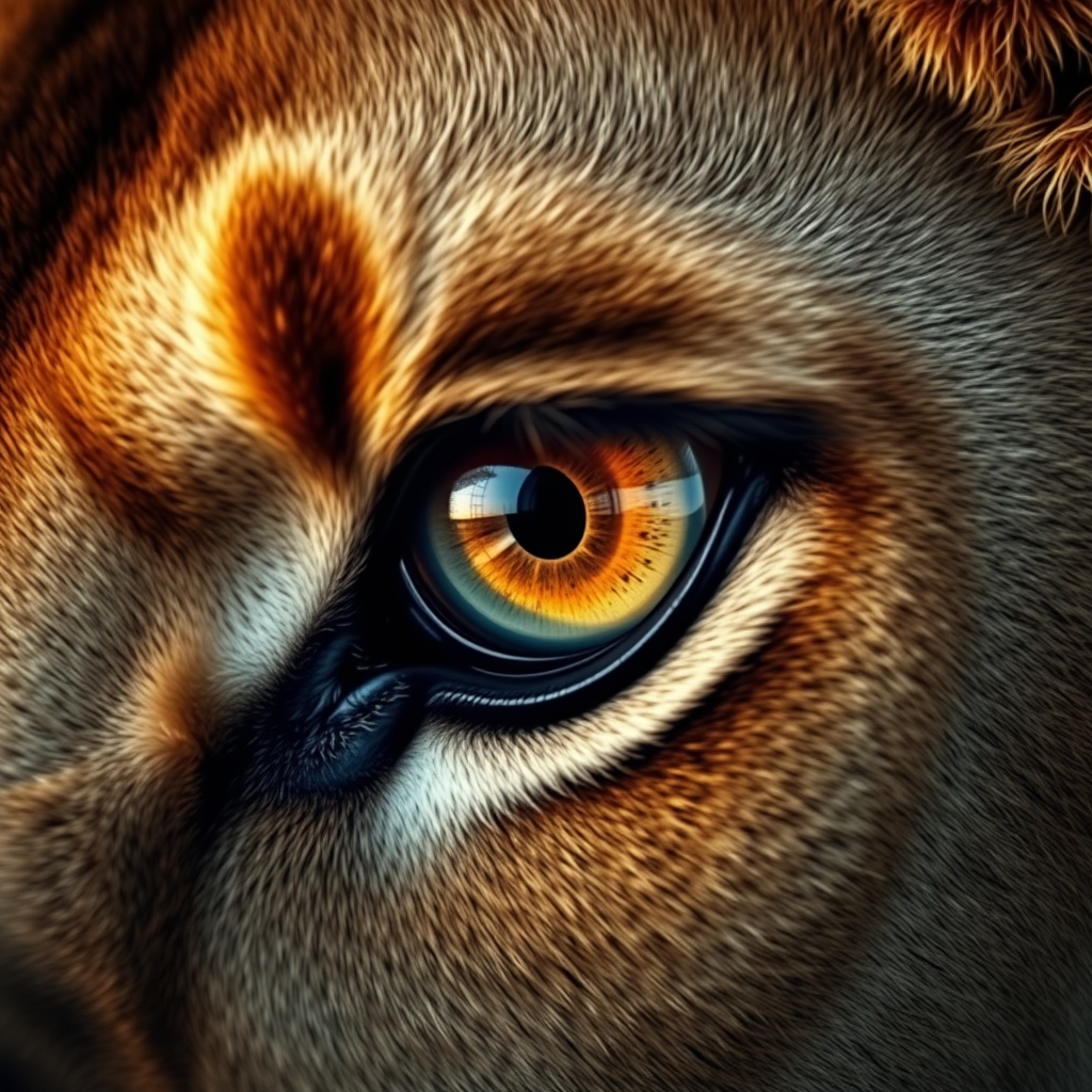 Hypermacro photograph of a lioness's eye, capturing intensity and primal energy, filled with fiery determination, lifelike and vividly expressive, showcasing intricate details and dynamic textures, with cinematic shadows and luminous highlights, evoking realism and depth in an ultra-detailed, ultra-realistic portrayal, enhanced by intricate lighting, exquisite focus, and unparalleled clarity, presenting a 4D immersive experience.
