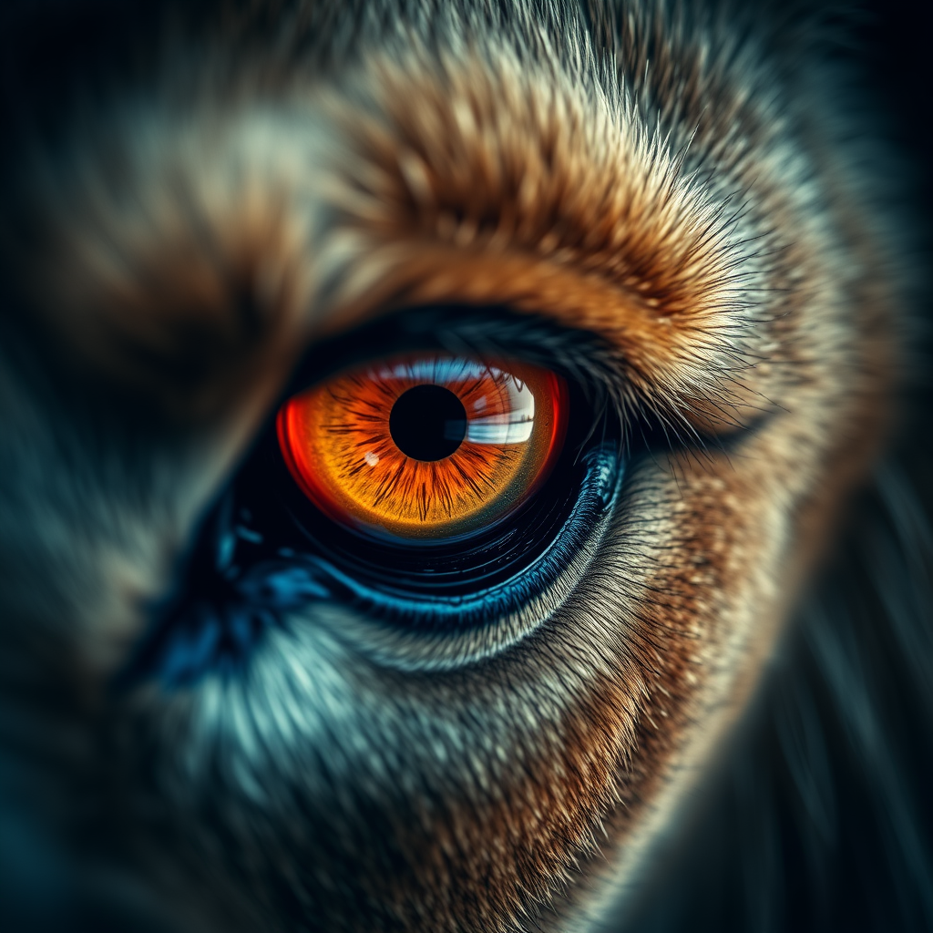 Hypermacro photograph of a lion's eye, intensely fierce and full of raw emotion, showcasing its fiery rage and power, rendered in ultra-realistic detail. The eye is expressive and captures the lion's ferocity, highlighted with cinematic and dramatic lighting. The hyperrealism of the image brings it to life with an extraordinary level of detail, offering a 4D dimension experience that immerses the viewer in the lion's world. Capture is of the highest quality, delivering an unmatched level of ultra-realism and intricate detailing through expert photography lighting.