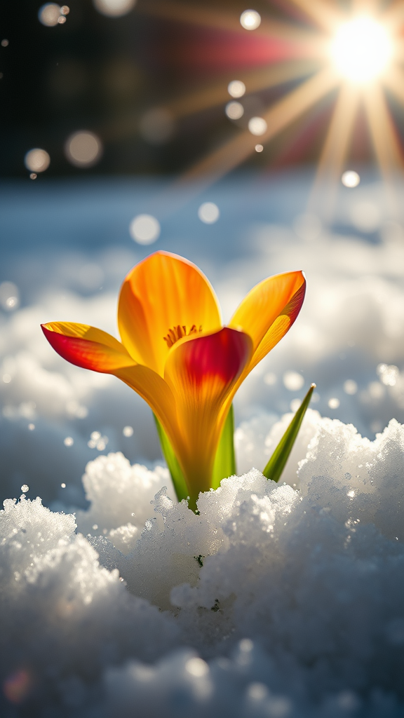 Hypermacro photograph of a vibrant spring flower bursting through a swirling blizzard, its delicate petals illuminated by radiant sunbeams, heralding the arrival of springtime. The scene captures an ethereal and dreamlike essence reminiscent of a fantasy realm, as if chronicled in a fantastical epic. Shot with a Hasselblad H4D 200MS Digital Camera and Mitakon Speedmaster 300mm f/4 lens, the photo features exquisite lighting, highlighting the intricate beauty and resilience of nature.