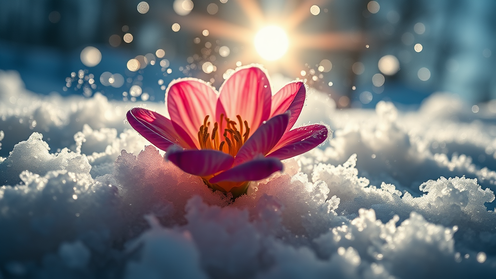Hypermacro photograph of a vibrant Spring flower, intricately detailed and emerging through a swirling blizzard, illuminated by dazzling sunbeam rays, heralding the arrival of springtime, in a style reminiscent of a fantastical epic, captured using a Hasselblad H4D 200MS Digital Camera with a Mitakon Speedmaster 300mm f/4 XCD lens, featuring dramatic lighting.
