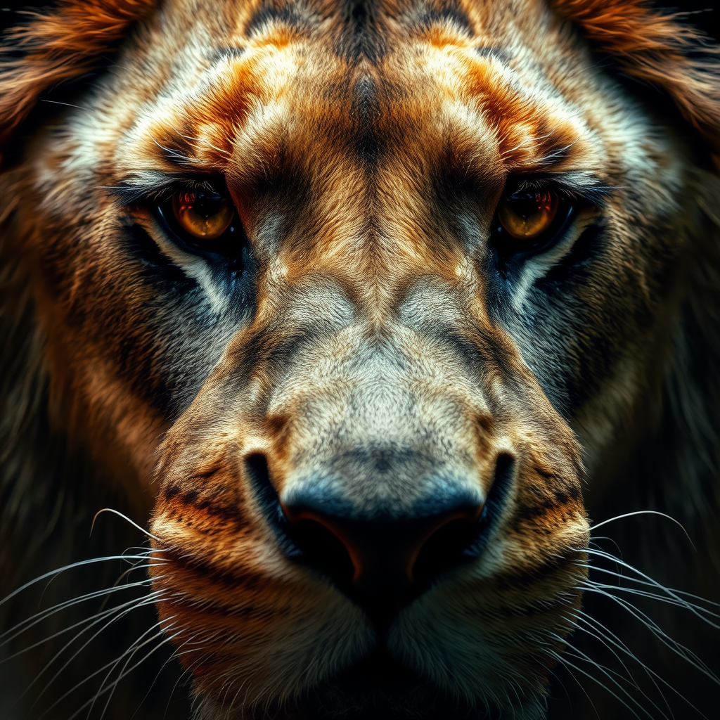 Hypermacro photography capturing an ultra close-up of a lion's eye, exuding intensity and raw power, with vivid expressions of ferocity and controlled fury. The image is deeply realistic, embracing hyperrealism and cinematic lighting, emphasizing every minute detail in 4D dimension. The scene is infused with ultra-detailed textures and the highest quality of realism, enhanced by professional photography lighting.