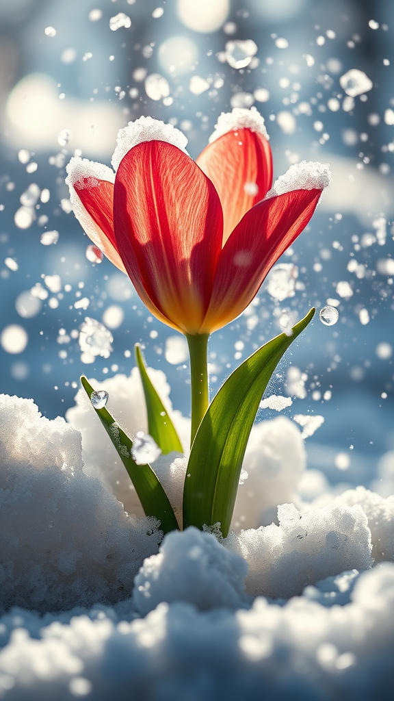 Hypermacro photography capturing the vibrant details of a spring flower emerging defiantly through a swirling blizzard, its petals illuminated by radiant sunbeams, signaling the arrival of springtime. Styled with a fantastical elegance reminiscent of a fantasy realm, the image is shot with the precision of a Hasselblad H4D 200MS Digital Camera and a Mitakon Speedmaster 300mm f/4 XCD lens, under strikingly dramatic lighting, emphasizing the contrast and beauty of nature's resilience.