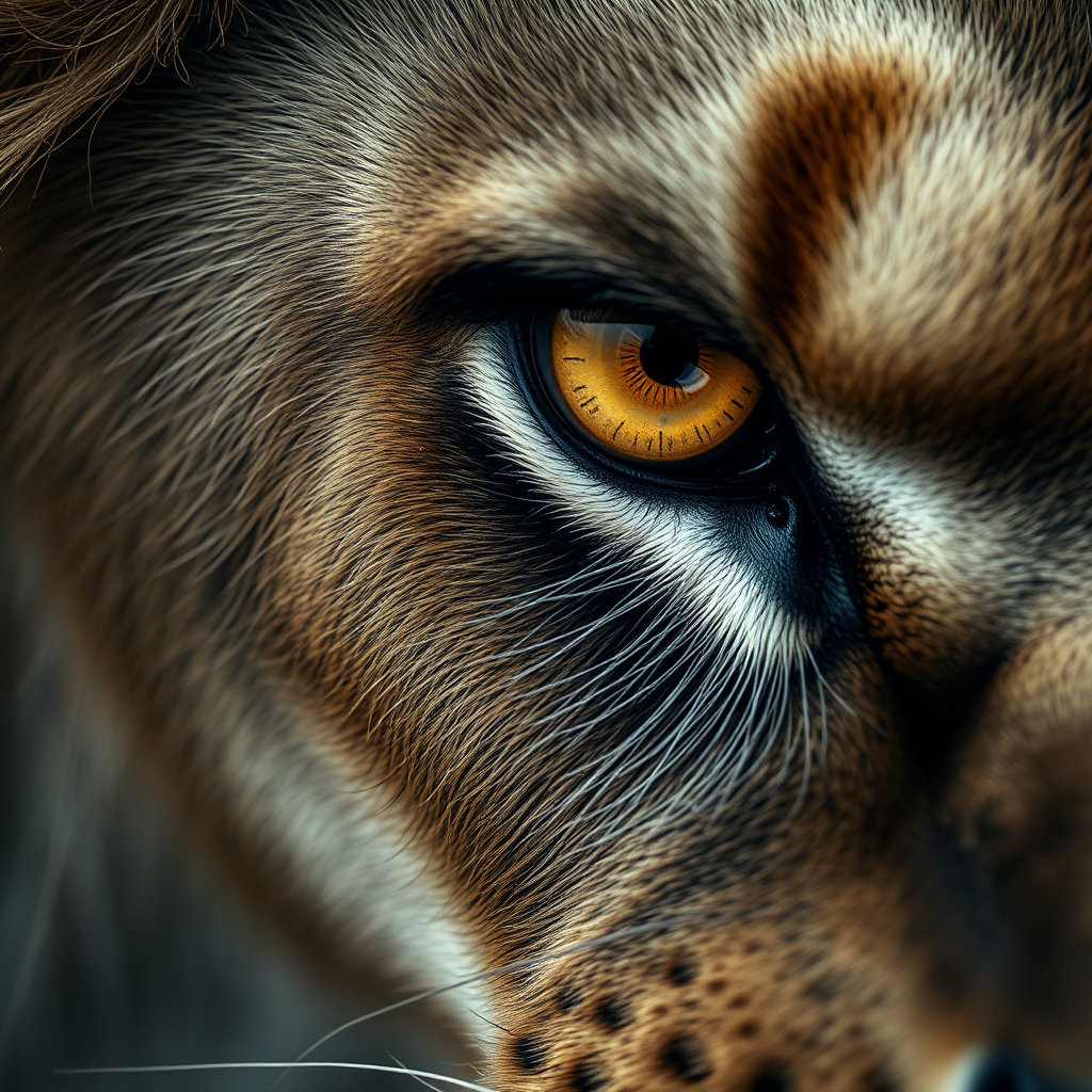 Hypermacro photography close-up of a lion's eye, capturing intense fierceness and raw emotion, enraged gaze with expressive detail, photorealistic and hyperrealistic with cinematic lighting. Focus on ultra-realism and intricate detailing, 4D dimension quality, showcasing the highest level of detail and realistic photography lighting.
