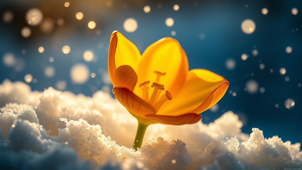 Hypermacro photography of a delicate, vibrant spring flower emerging resiliently through a swirling blizzard, with golden sunbeams casting a warm glow on its petals, signaling the arrival of springtime, captured in a fantastical and epic style. Shot with a Hasselblad H4D 200MS Digital Camera using a Mitakon Speedmaster 300mm f/4 XCD lens, featuring dramatic lighting that highlights the intricate details and textures of the flower.