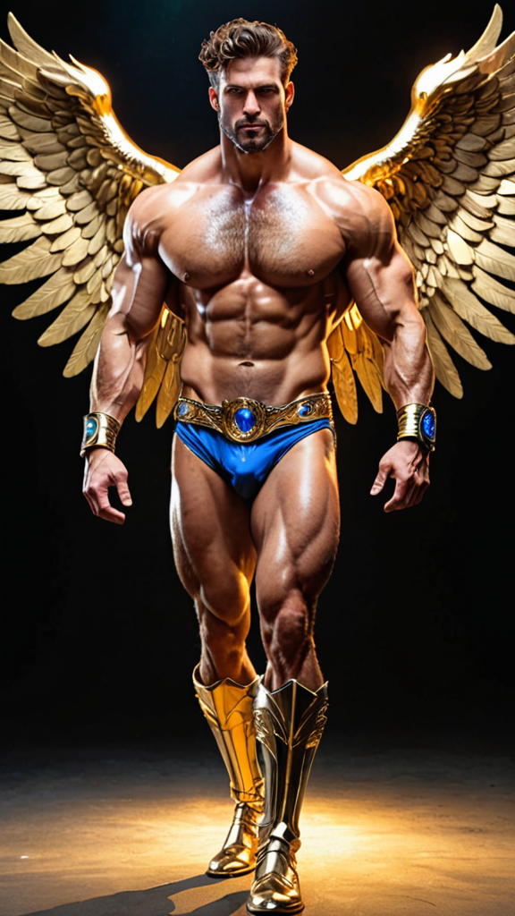 hypermasculine male, Caucasian male. Archangel, celestial, galaxy protector, warrior Angel, hirsute. Tall. muscular, sinewy, broad shoulders, broad chest, wide back, narrow waist, strong muscular legs, thick hairy forearms. Bodybuilder physique. Extremely hairy chest, abs, arms, thighs, legs. Dark brown hair, short length wavy fade style, cut close on sides with tousled curls on top. Golden headband tied around head/brow. Strong brow, squared jaw, thick brows, handsome, rugged good looks. Clean shaven, beardless. {{Electric blue eyes}} glowing and bright. Metallic gold pauldrons with sapphire gems on both shoulders, metallic gold bracers with sapphire accents on his hairy arms. Metallic gold harness across his hirsute hairy chest; gold ring in the middle, metallic straps on both sides of shoulders, the other two under each Pectoral. An ornate gold belt with sapphire gems around his waist. A metallic gold sheer loincloth covering his girthy penis, revealing hairy muscular thighs. Metallic gold boots, up to mid calf. Enormous gold Angel wings, spread open and flying. He shines with a golden aura of light, bright as the sun. Full body pose, flying through space.