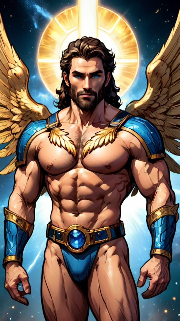 hypermasculine male, Caucasian male. Archangel, celestial, galaxy protector, warrior Angel, hirsute. Tall. muscular, sinewy, broad shoulders, broad chest, wide back, narrow waist, strong muscular legs, thick hairy forearms. Bodybuilder physique. Extremely hairy chest, abs, arms, thighs, legs. Dark brown hair, short length wavy fade style, cut close on sides with tousled curls on top. Golden headband tied around head/brow. Strong brow, squared jaw, thick brows, handsome, rugged good looks. Clean shaven, beardless. {{Electric blue eyes}} glowing and bright. Metallic gold pauldrons with sapphire gems on both shoulders, metallic gold bracers with sapphire accents on his hairy arms. Metallic gold harness across his hirsute hairy chest; gold ring in the middle, metallic straps on both sides of shoulders, the other two under each Pectoral. An ornate gold belt with sapphire gems around his waist. Naked from the waist down, revealing a bush of thick pubes and a long, girthy penis. Metallic gold boots, up to mid calf. Enormous gold Angel wings, spread open and flying. He shines with a golden aura of light, bright as the sun. Full body pose, flying through space.