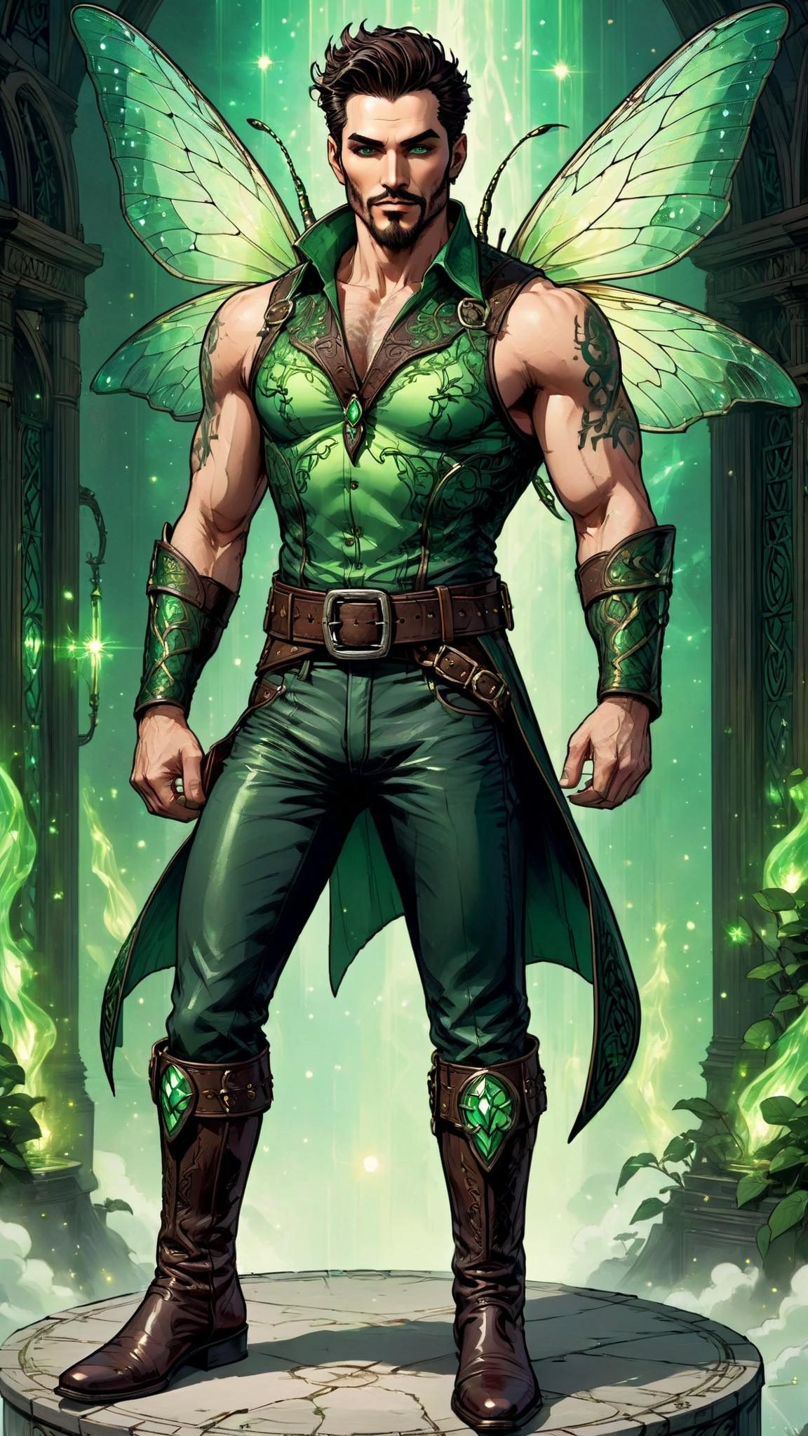 hypermasculine male. Celtic origins. Fairy, part pixie. Short and stocky, but very well built. Broad shoulders, broad chest, narrow waist. Fair skinned, twinkling jade green eyes. Very short dark brown hair, usually slicked back/combed back with a green velvet Victorian tophat on top of his head. Handsome face, rugged looks. Strong brow and chin, dark brown goatee on face. He wears a sheer green fishnet shirt with swirly patterns in various shades of green; it fits tight across his chest. Black leather bracers on his arms, a black leather studded belt around his waist. The belt has a huge green emerald belt buckle. Form-fitting green jeans, the legs tucked into tall black leather boots with silver buckles. He has a pair of large, over-sized dragonfly wings, green and translucent--he uses them to fly. He glows with a shiny green aura and leaves a trail of twinkling green pixie dust wherever he goes. It twinkles like stars. He carries a glowing silver short sword, the hilt decorated with emeralds. Full body pose, flying through the clouds, rainbows in the sky.