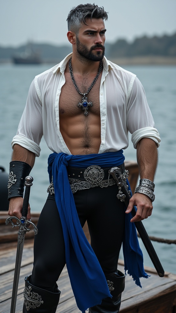 Hypermasculine male. Macho. White Caucasian male, Russian origin. Tall, muscular, sinewy, strong, broad chested, wide shouldered, narrow waist. Extremely hairy, hirsute body. Pale grey eyes, handsome rugged face, strong brow, chiseled chin with dimple, slight thin black mustache. Short black hair with silver streak up front, wavy fade hairstyle with curls pushed to one side. Silky white sheer long sleeved collared shirt unbuttoned to navel, revealing hairy chest. Long, loose sleeves above hairy wrists. Celtic Cross with sapphire sliver chain around the neck. Long royal blue sash around the waist, flowing in the wind. Shiny black form-fitting tights/pants, legs powerful and muscular. Pants tucked into black leather pirate boots, boots adorned with silver metallic designs. Black belt strap across his chest, holding a sapphire jeweled bastard sword. Swordsman fighting stance, full body pose.