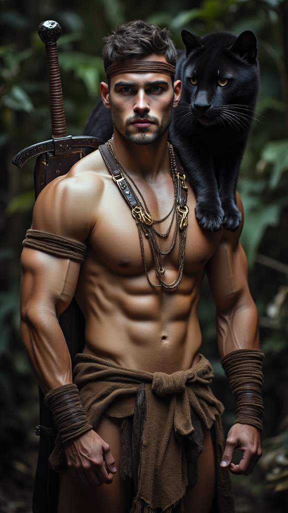 hypermasculine male, manly. Caucasian jungle man, dark brown hair short on sides longer on top. A brown leather band tied around the forehead. Tanned skin, smooth and hairless. Pale grey eyes with intense spiritual gaze. Strong brow and chiseled strong jaw, handsome, rugged looks. Soul patch on face. Tall, strong, muscular, sinewy, well defined, broad shoulders, broad chest, wide back. Olympian gymnast build/body. Gold necklace/talisman with leather strap around the neck. Wrapped brown leather bands around wrists, bands around tops of biceps, accenting big arms. Brown o-ring harness on the chest, strapped from the shoulder. Brown leather loincloth, barely covering the crotch area, exposing strong powerful legs. Soft, brown cloth knee-high boots wrapped around legs. Full body pose. He wields a unique bastard sword that he straps to his back. He keeps company with a huge, sleek black panther. ((MASTERPIECE))