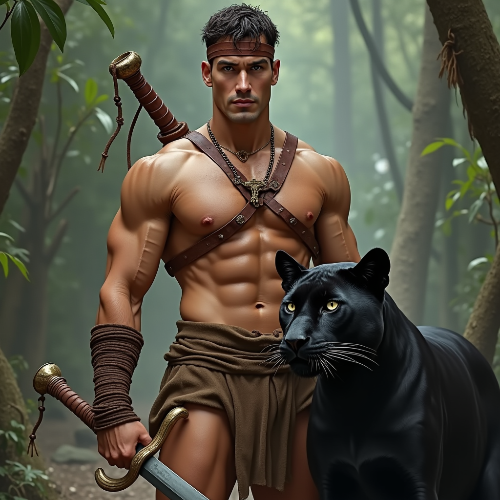 hypermasculine male, manly. Caucasian jungle man, dark brown hair short on sides longer on top. A brown leather band tied around the forehead. Tanned skin, smooth and hairless. Pale grey eyes with intense spiritual gaze. Strong brow and chiseled strong jaw, handsome, rugged looks. Soul patch on face. Tall, strong, muscular, sinewy, well defined, broad shoulders, broad chest, wide back. Olympian gymnast build/body. Gold necklace/talisman with leather strap around the neck. Wrapped brown leather bands around wrists, bands around tops of biceps, accenting big arms. Brown o-ring harness on the chest, strapped from the shoulder. Brown leather loincloth, barely covering the crotch area, exposing strong powerful legs. Soft, brown cloth knee-high boots wrapped around legs. Full body pose. He wields a unique bastard sword that he straps to his back. He keeps company with a huge, sleek black panther. ((MASTERPIECE))