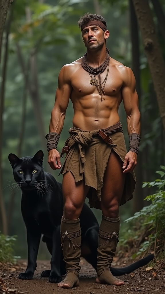 hypermasculine male, manly. Caucasian jungle man, dark brown hair short on sides longer on top. A brown leather band tied around the forehead. Tanned skin, smooth and hairless. Pale grey eyes with intense spiritual gaze. Strong brow and chiseled strong jaw, handsome, rugged looks. Soul patch on face. Tall, strong, muscular, sinewy, well defined, broad shoulders, broad chest, wide back. Olympian gymnast build/body. Gold necklace/talisman with leather strap around the neck. Wrapped brown leather bands around wrists, bands around tops of biceps, accenting big arms. Brown o-ring harness on the chest, strapped from the shoulder. Brown leather loincloth, barely covering the crotch area, exposing strong powerful legs. Soft, brown cloth knee-high boots wrapped around legs. Full body pose. He wields a unique bastard sword that he straps to his back. He keeps company with a huge, sleek black panther. ((MASTERPIECE))