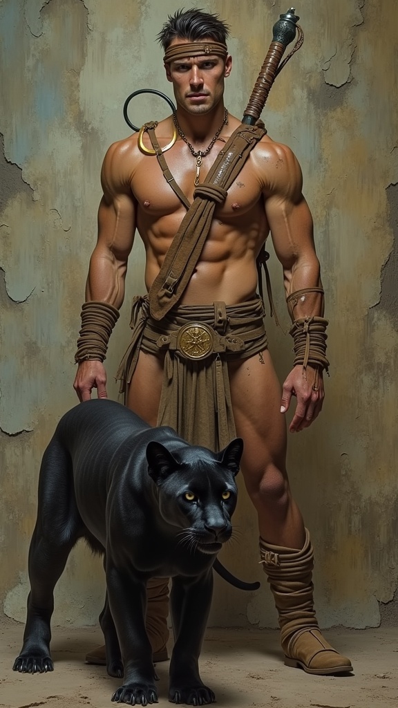 hypermasculine male, manly. Caucasian jungle man, dark brown hair short on sides longer on top. A brown leather band tied around the forehead. Tanned skin, smooth and hairless. Pale grey eyes with intense spiritual gaze. Strong brow and chiseled strong jaw, handsome, rugged looks. Soul patch on face. Tall, strong, muscular, sinewy, well defined, broad shoulders, broad chest, wide back. Olympian gymnast build/body. Gold necklace/talisman with leather strap around the neck. Wrapped brown leather bands around wrists, bands around tops of biceps, accenting big arms. Brown o-ring harness on the chest, strapped from the shoulder. Brown leather loincloth, barely covering the crotch area, exposing strong powerful legs. Soft, brown cloth knee-high boots wrapped around legs. Full body pose. He wields a unique bastard sword that he straps to his back. He keeps company with a huge, sleek black panther. ((MASTERPIECE))
