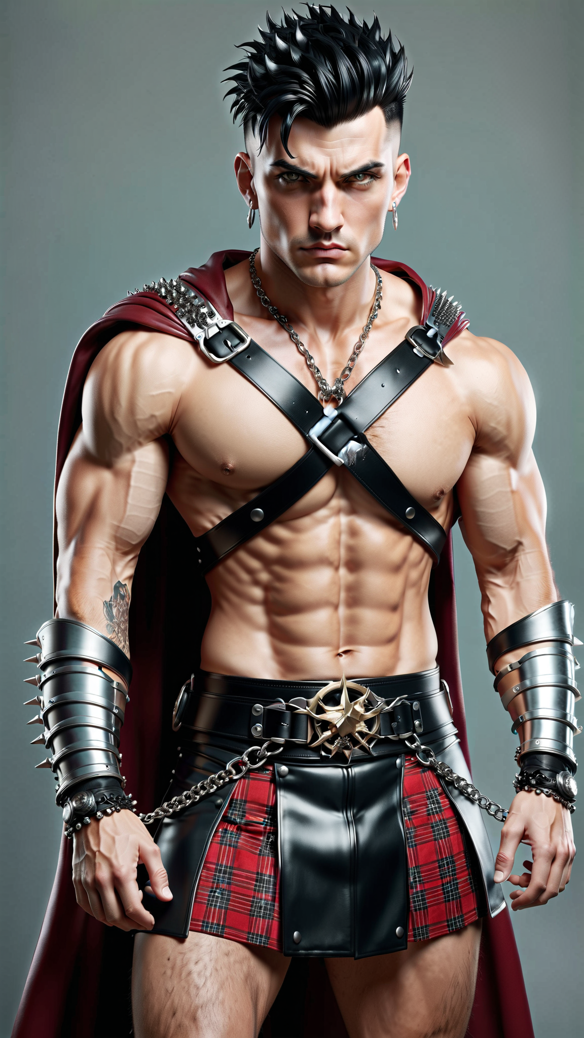 hypermasculine male super-hero. British Punk Rocker. Young man, college aged. Jet-black hair, shark fin Mohawk with shaved hair on the sides of head. Pale grey eyes, intense gaze, slight scowl on face. Handsome, strong brow and jaw. Soul Patch on face. Strong, muscular, sinewy, brute, broad chest and powerful legs. Extremely hairy hirsute body, especially on chest, torso, armpits and legs. Scorpion tattoo on chest. O-ring chain harness on chest. Black leather bracers/armbands with spikes. Dark red short cape, tattered and torn. Full kilt, red and black tartan pattern, no underwear underneath. Black leather studded belt. Kilt is worn and tattered, exposing hairy legs underneath. Black leather combat boots. Full body pose, fighting stance. British flag in background.