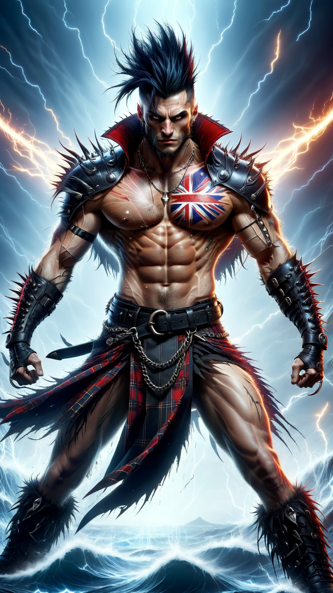 hypermasculine male super-hero. British Punk Rocker. Young man, college aged. Jet-black hair, shark fin Mohawk with shaved hair on the sides of head. Pale grey eyes, intense gaze, slight scowl on face. Handsome, strong brow and jaw. Soul Patch on face. Strong, muscular, sinewy, brute, broad chest and powerful legs. Extremely hairy hirsute body, especially on chest, torso, armpits and legs. Scorpion tattoo on chest. O-ring chain harness on chest. Black leather bracers/armbands with spikes. Dark red short cape, tattered and torn. Full kilt, red and black tartan pattern, no underwear underneath. Black leather studded belt. Kilt is worn and tattered, exposing hairy legs underneath. Black leather combat boots. Full body pose, fighting stance. British flag in background.