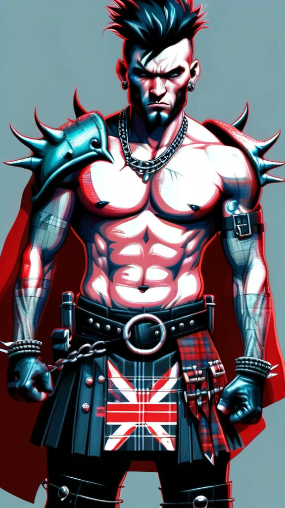 hypermasculine male super-hero. British Punk Rocker. Young man, college aged. Jet-black hair, shark fin Mohawk with shaved hair on the sides of head. Pale grey eyes, intense gaze, slight scowl on face. Handsome, strong brow and jaw. Soul Patch on face. Strong, muscular, sinewy, brute, broad chest and powerful legs. Extremely hairy hirsute body, especially on chest, torso, armpits and legs. Scorpion tattoo on chest. O-ring chain harness on chest. Black leather bracers/armbands with spikes. Dark red short cape, tattered and torn. Full kilt, red and black tartan pattern, no underwear underneath. Black leather studded belt. Kilt is worn and tattered, exposing hairy legs underneath. Black leather combat boots. Full body pose, fighting stance. British flag in background.